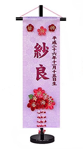 大人気の刺繍名前旗です。かんざしの部分は取り外し可能で、ブローチや髪飾りとして使用できます。生地は京都西陣の金襴織、老舗織物店にて柔らかく輝くパール糸を織り込んだ優しいピンク色となっています。伝統工芸つまみ細工のかんざしはすべてが手作りです。正絹羽二重生地やちりめんの生地を使用し、熟練の職人がひとつひとつ作り上げたものです。(高さ55cm)
