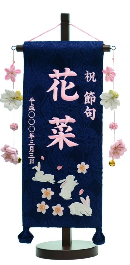 桃の節句のお祝い名前旗です。うさぎの刺繍がついています。通常名前旗は左右に房が付いていますが、この名前旗はつるし飾りになっています。名前はピンクの刺繍になります。お子様の名前、生年月日が入ります。高さ約39cm。